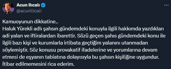 Yürekli’nin argümanları sonrası sessizliğini bozan Ilıcalı toplumsal medya hesabından yaptığı açıklamada, “Kamuoyunun dikkatine. Haluk Yürekli isimli şahsın gündemdeki bahisle ilgili hakkımda yazdıkları ismi palavra ve iftiralardan ibarettir. Kelamı geçen şahıs gündemdeki husus ile ilgili birtakım kişi ve kurumlarla irtibata geçtiğim palavrasını utanmadan söylemiştir. Kelam konusu provakatif sözlerine ve yorumlarına devam etmesi de eşyanın tabiatına hasebiyle bu şahsın kişiliğine uygundur. Prestij edilmemesini rica ederim” sözlerini kullandı.