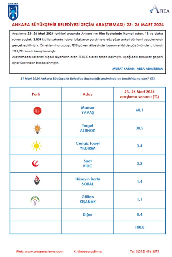 Resmi olmayan sonuçlara nazaran Ankara’da CHP adayı Mansur Yavaş, Ak Partili rakibi Turgut Altonok’a fark atarak kazandı. Yüzde 60,35 oy alan Yavaş’ı, yüzde 31.69 ile Altınok izledi. AREA Araştırma, Mansur Yavaş’a yüzde 60,1, Altınok’a ise yüzde 30,5oy oranı vererek neredeyse nokta atışı seçim kestirimi yaptı.