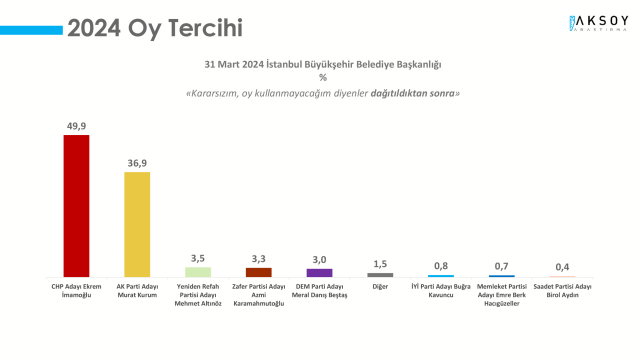 Türkiye’de vatandaşlar yaşadığı vilayet haricinde en çok Ankara ve İstanbul’un seçim sonuçlarını merak ediyordu. Murat Kurum ve Ekrem İmamoğlu ortasında geçen yarışın kazananıyüzde 51.09 oy ortanı ile İmamoğlu oldu. Aksoy Araştırma, 2400 bireyle yapılan çalışmada Ekrem İmamoğlu için yüzde 49,9 , Murat Kurum için ise yüzde 39,6 sonucunu paylaşmıştı. Bu sonuçlara nazaran Aksoy Araştırma, 1.19 farkla sonuca en yakın bilgiyi iddia eden şirket oldu.