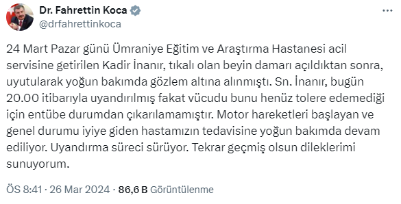 Sayın İnanır, bugün 20.00 prestijiyle uyandırılmış lakin bedeni bunu şimdi tolere edemediği için entübe durumdan çıkarılamamıştır. Motor hareketleri başlayan ve genel durumu uyguna giden hastamızın tedavisine ağır bakımda devam ediliyor. Uyandırma süreci sürüyor. Tekrar geçmiş olsun dileklerimi sunuyorum.”