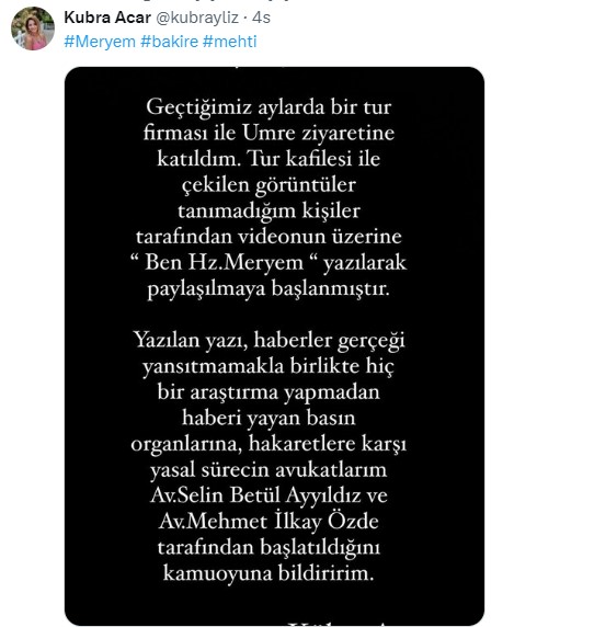 Görüntünün toplumsal medyada süratle yayılmasının akabinde Instagram hesabından açıklama yapan Kübra Acar, “Geçtiğimiz aylarda bir tıp firması ile Umre ziyaretine katıldım. Tıp kafilesi ile çekilen imgeler tanımadığım şahıslar tarafından görüntünün üzerine ‘Ben Hz. Meryem’ yazılarak paylaşılmaya başlanmıştı. Yazılan yazı, haberler gerçeği yansıtmamakla birlikte hiçbir araştırma yapmadan haberi yayan basın organlarına, hakaretlere karşı yasal sürecin avukatlarım tarafından başlatıldığını kamuoyuna bildiririm” dedi.