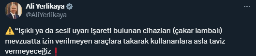 İçişleri Bakanı Ali Yerlikaya, toplumsal medya hesabından Pendik Kaymakamlığının duyurusunu paylaşıp, “Işıklı ya da sesli ikaz işareti bulunan aygıtları (çakar lambalı) mevzuatta müsaade verilmeyen araçlara takarak kullananlara asla taviz vermeyeceğiz!” dedi.