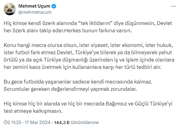 Uçum’un X hesabından yaptığı iletisi şöyle; “Hiç kimse kendi özerk alanında “tek iktidarım” diye düşünmesin, Devlet her özerk alanı takip eder. Herkes bunun farkına varsın. Bahis hangi mecra olursa olsun, ister siyaset, ister iktisat, ister hukuk, ister futbol fark etmez Devlet, Türkiye’ye bilerek ya da bilmeyerek veyahut örtülü ya da açık Türkiye düşmanlığı üzerinden iş ve süreç içinde olanlara her tabanı kaos üretmek için kullananlara karşı her türlü önlemi alır.