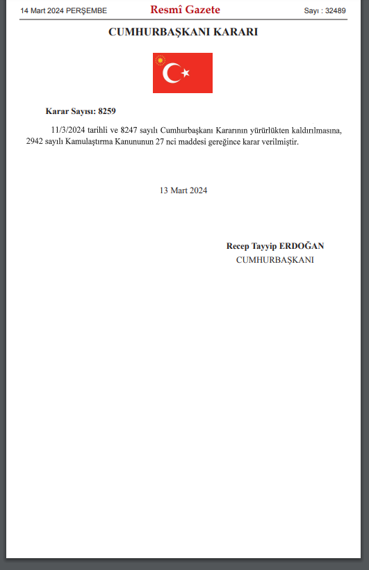 İlgili kararın yürürlükten kaldırılmasına ait Cumhurbaşkanı Kararı, Resmi Gazete’nin bugünkü sayısında yayımlandı.