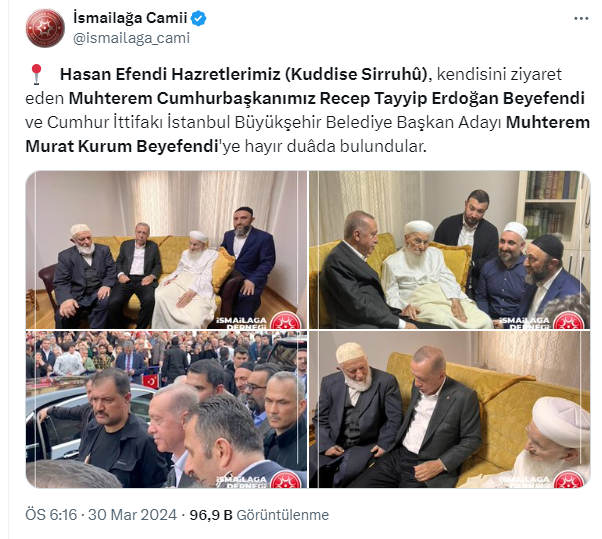 İsmailağa Cemaati tarafından yapılan açıklamada şu tabirler kullanıldı: “Hasan Efendi Hazretlerimiz (Kuddise Sirruhû), kendisini ziyaret eden Saygıdeğer Cumhurbaşkanımız Recep Tayyip Erdoğan Beyefendi ve Cumhur İttifakı İstanbul Büyükşehir Belediye Lider Adayı Saygıdeğer Murat Kurum Beyefendi’ye hayır duâda bulundular”