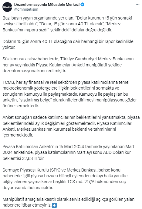 Doların 15 gün sonra 40 lira olacağına dair rastgele bir raporun olmadığı kaydedilen açıklamada, kelam konusu temelsiz haberlerde, Türkiye Cumhuriyet Merkez Bankasının (TCMB) her ay yayımladığı Piyasa İştirakçileri Anketi’nin manipülatif formda dezenformasyona bahis edildiği belirtildi.