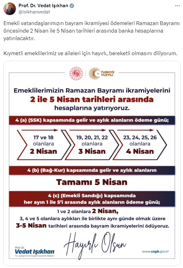 Bakan Işıkhan “Emekli vatandaşlarımızın bayram ikramiyesi ödemeleri Ramazan Bayramı öncesinde 2 Nisan ile 5 Nisan tarihleri ortasında banka hesaplarına yatırılacaktır” açıklamasını yaptı.