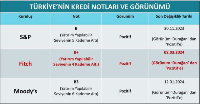 Fitch Ratings, 8 Eylül 2023’te Türkiye’nin kredi notunu “B” olarak teyit ederken, not görünümünü 2 yılın akabinde “negatif”ten “durağan”a çıkarmıştı. Fitch’in takvimine nazaran Türkiye’ye ait bir sonraki değerlendirmenin 6 Eylül’de yapılması planlanıyor.