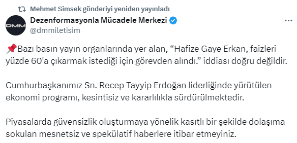 Kurumun X hesabından yapılan paylaşımda “‘Hafize Gaye Erkan, faizleri yüzde 60’a çıkarmak istediği için misyondan alındı’ tezi yanlışsız değildir.