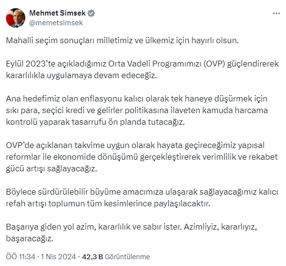 CHP’nin damga vurduğu 31 Mart seçimlerinin akabinde Hazine ve Maliye Bakanı Mehmet Şimşek “Mahalli seçim sonuçları milletimiz ve ülkemiz için iyi olsun” bildirisini paylaştı.