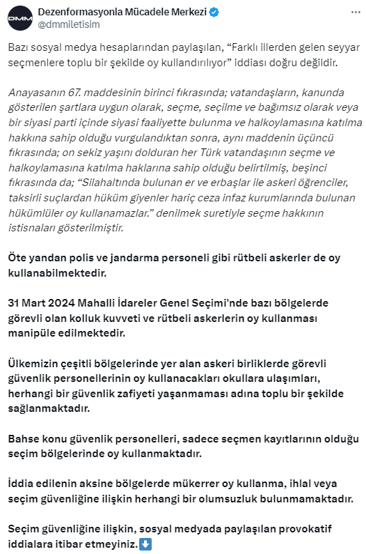 İletişim Başkanlığı Dezenformasyonla Gayret Merkezi, kimi toplumsal medya hesaplarından paylaşılan, “Farklı vilayetlerden gelen seyyar seçmenlere toplu bir halde oy kullandırılıyor” tezi gerçek olmadığını açıkladı.