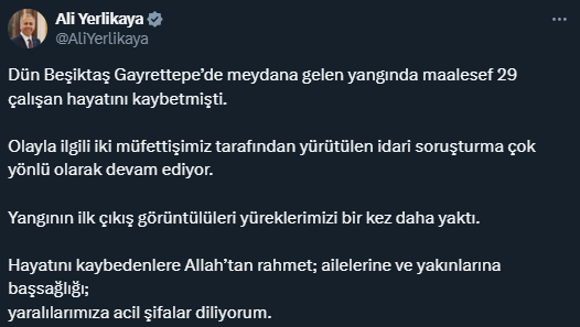 Yerlikaya yangının birinci çıkış anına ilişkin imajları paylaşarak, “Dün Beşiktaş Gayrettepe’de meydana gelen yangında maalesef 29 çalışan hayatını kaybetmişti. Olayla ilgili iki müfettişimiz tarafından yürütülen idari soruşturma çok taraflı olarak devam ediyor. Yangının birinci çıkış görüntülüleri yüreklerimizi bir kere daha yaktı. Hayatını kaybedenlere Allah’tan rahmet; ailelerine ve yakınlarına başsağlığı, yaralılarımıza acil şifalar diliyorum.” tabirlerini kullandı.