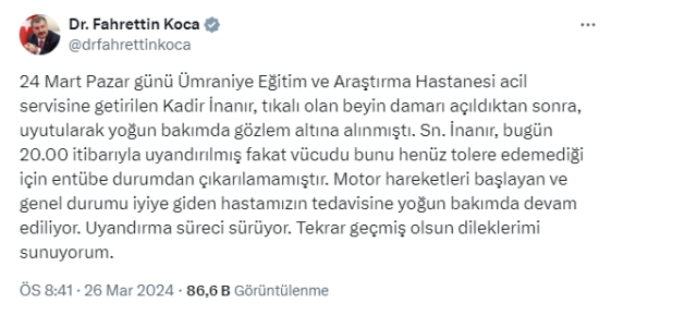 Sayın İnanır, bugün 20.00 prestijiyle uyandırılmış ancak bedeni bunu şimdi tolere edemediği için entübe durumdan çıkarılamamıştır. Motor hareketleri başlayan ve genel durumu uyguna giden hastamızın tedavisine ağır bakımda devam ediliyor. Uyandırma süreci sürüyor. Tekrar geçmiş olsun dileklerimi sunuyorum.”