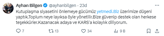 Bilgen, “Kutuplaşma siyasetini önlemeye gücümüz yetmedi. Biz üzerimize düşeni yaptık. Toplum neye layıksa o denli yönetilir. Bize güvenip dayanak olan herkese teşekkürler. Kazanacak adaya ve Kars’a kolaylık diliyorum” dedi.