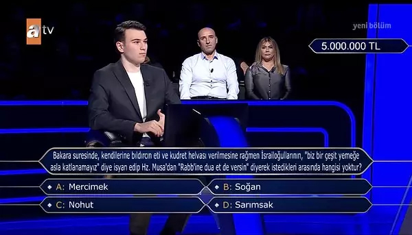 Geçtiğimiz hafta 19 yaşındaki genç yarışmacı Berk Göktaş’ın performansı, göz doldurmuştu. Bu hafta büyük ödül olan 5 milyon TL’lik soruyu açtırmaya hak kazanan yarışmacının hangi karşılığı vereceği merak konusu oldu.