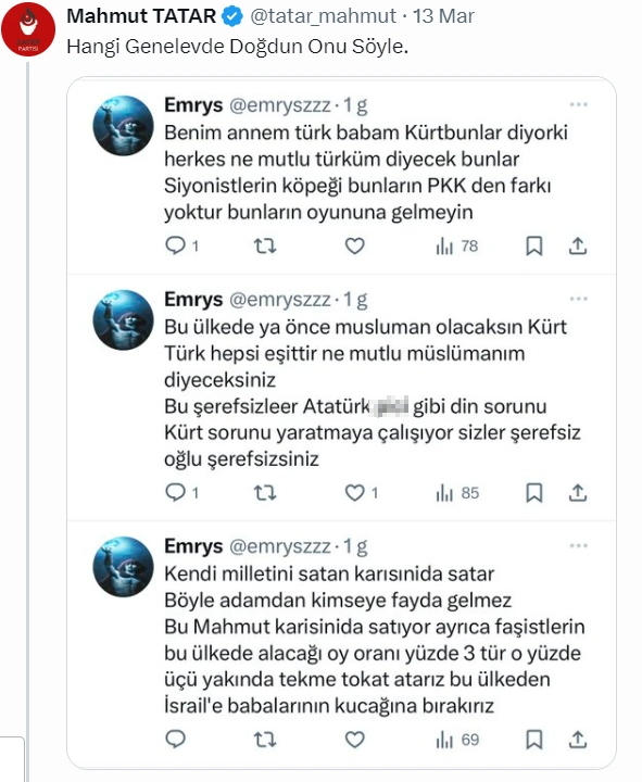 Atatürk’e küfreden bir kullanıcı, “Kendi milletini satan karısını da satar. Bu türlü adamdan kimseye yarar gelmez. Bu Mahmut karısını da satıyor” diyerek Tatar’a küfretti. Tatar ise “Hangi genelevde doğdun onu söyle” biçiminde karşılık verdi.