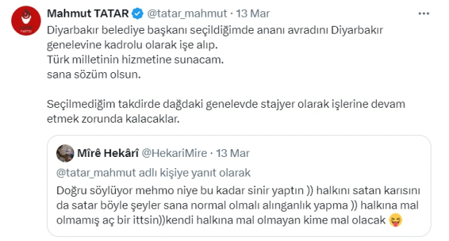 Zafer Partisi‘nden 31 Mart’taki lokal seçimlerde Diyarbakır Büyükşehir Belediye Lider Adayı olan Mahmut Tatar, toplumsal medya hesabından 2 bireyle tartıştı.