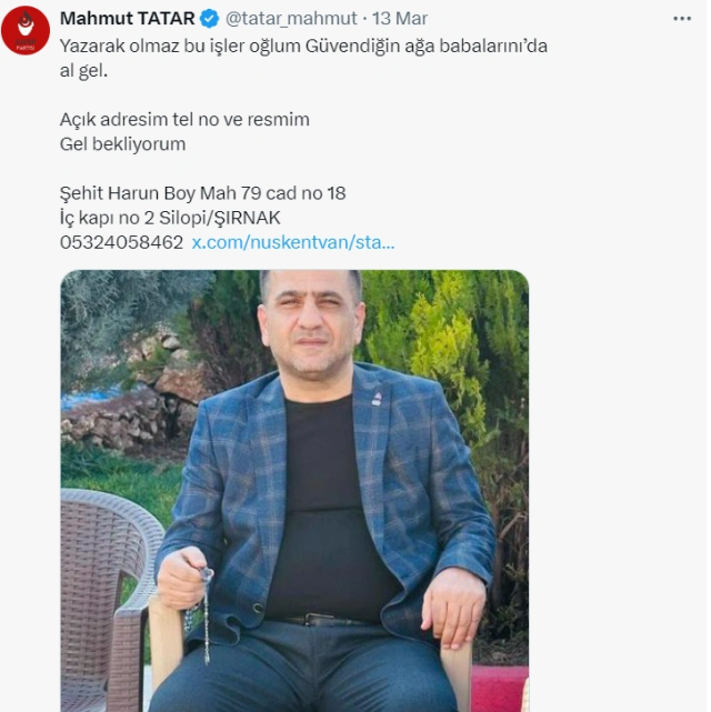 Zafer Partili Tatar ayrıyeten, toplumsal medyadan kendisine küfredenlere açık adresini ve cep telefonu numarasını paylaşarak, “Yazarak olmaz bu işler oğlum. Güvendiğin ağa babalarını da al gel.” dedi.