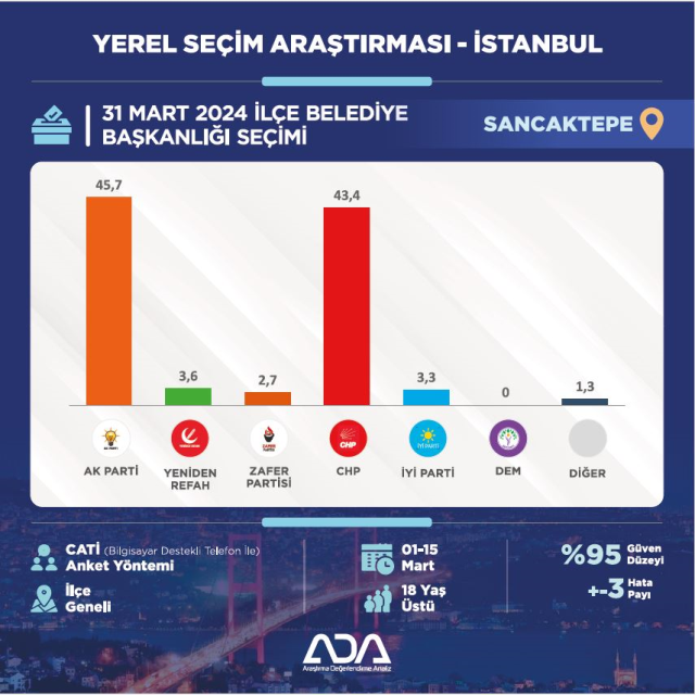 Seçim sonucunun en çok merak edildiği İstanbul’da ilçe belediyeleri de büyük kıymet taşıyor. Son güne kadar aralıksız devam eden çalışmalarda adaylar kendilerine oy istiyor. 2019 yılında yapılan seçimlerde İstanbul’un tek bayan Belediye Lideri olarak seçilen Sancaktepe Belediye Lideri Şeyma Döğücü yeni devirde tekrar aday gösterildi. Yapılan ankette ise Döğücü’nün yüzde 45,7 ile seçimi kazandığı görüldü.