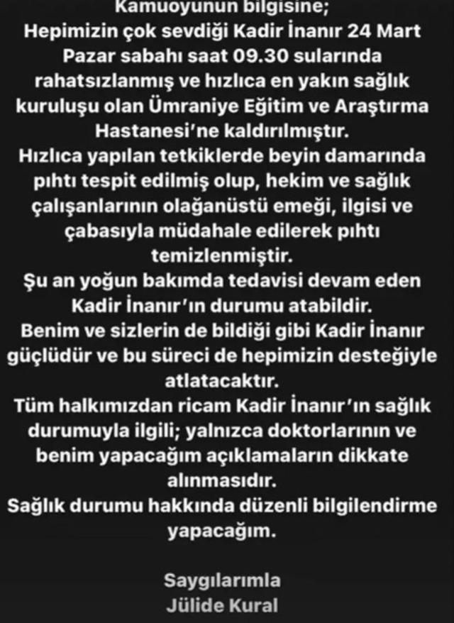 Kadir İnanır‘ın hayat arkadaşı Jülide Kural pıhtının temizlendiğini açıklayarak “Benim ve sizlerin de bildiği üzere Kadir İnanır güçlüdür ve bu süreci de atlatacaktır” dedi.