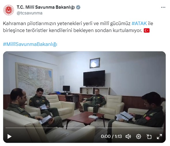 Bakanlığın paylaştığı görüntüye, “Kahraman pilotlarımızın yetenekleri yerli ve ulusal gücümüz ATAK ile birleşince teröristler kendilerini bekleyen sondan kurtulamıyor.” notu düşüldü.