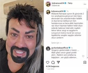 Kobra Murat, “Mübarek Ramazan ayının birinci gününde 2’inci ameliyatıma giriyorum, tüm İslam aleminden ve sevenlerimden helallik ve dua bekliyorum. Allah hepinizden razı olsun hepinize hakkım helal olsun, sizler de hakkınızı helal edin. Tekrar tekrar sevgi ve hürmetlerimi sunuyorum. 2 ay evvel bağırsak çatlaması ameliyatı olmuştum. Ortadan 2 ay geçti torbaları aldırmak için tekrardan ameliyat olacağım. Ancak birinci ameliyatın birebiri olacak. Kapalı ameliyat değil” halinde açıklama yaptı.