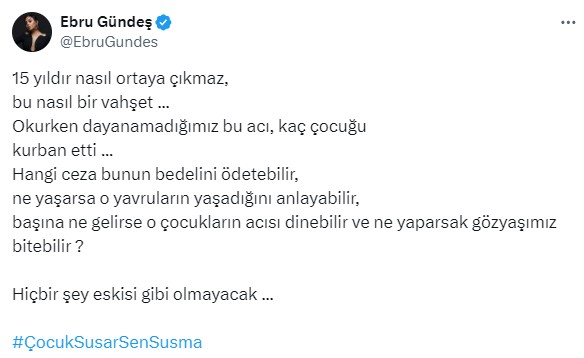 “15 yıldır nasıl ortaya çıkmaz, bu nasıl bir vahşet? Okurken dayanamadığımız bu acı, kaç çocuğu kurban etti… Hangi ceza bunun bedelini ödetebilir? Ne yaşarsa o yavruların yaşadığını anlayabilir? Başına ne gelirse o çocukların acısı dinebilir ve ne yaparsak gözyaşımız bitebilir? Hiçbir şey eskisi üzere olmayacak.”