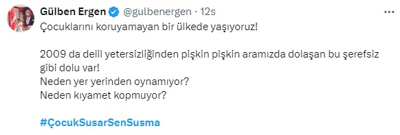 “Çocuklarını koruyamayan bir ülkede yaşıyoruz. 2009’da kanıt yetersizliğinden pişkin pişkin ortamızda dolaşan bu erdemsiz üzere dolu var. Neden yer yerinden oynamıyor? Neden kıyamet kopmuyor?”