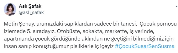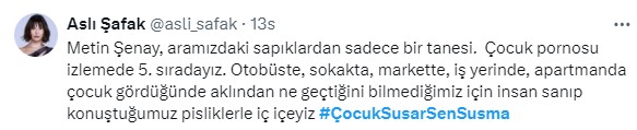 “Metin Şenay, aramızdaki sapıklardan yalnızca bir tanesi.Çocuk p….su izlemede 5. sıradayız. Otobüste, sokakta, markette, iş yerinde, apartmanda çocuk gördüğünde aklından ne geçtiğini bilmediğimiz için insan sanıp konuştuğumuz pisliklerle iç içeyiz #ÇocukSusarSenSusma”