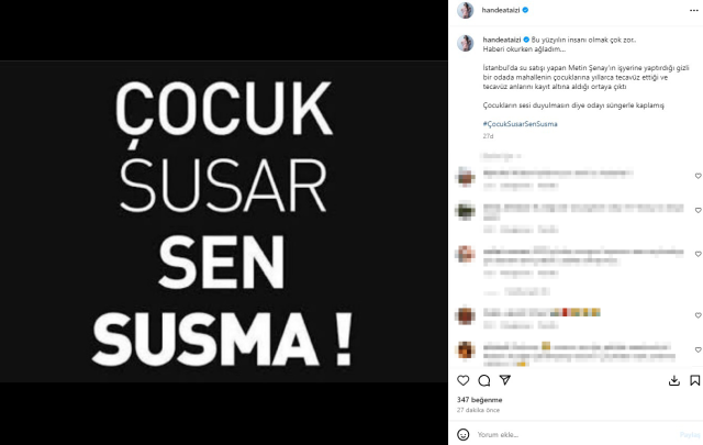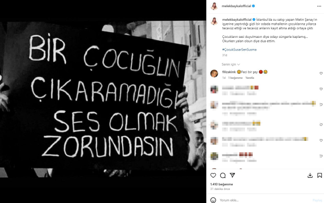 “Bugün duyduğum tek his utanç. İstanbul’da su satışı yapan Metin Şenay’ın işyerine yaptırdığı bâtın bir odada mahallenin çocuklarına yıllarca tecavüz ettiği ve tecavüz anlarını kayıt altına aldığı ortaya çıktı. Çocuk sesi duyulmasın diye odayı süngerle kaplamış.”