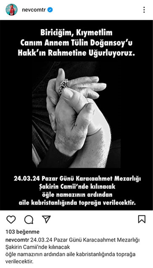Ünlü müzikçi Nev olarak bilinen Nevzat Doğansoy annesini kaybettiğini duyurdu. Nev ” Biriciğim, değerlim, canım annem Tülin Doğansoy’u hakkın rahmetine uğurluyoruz ” dedi.